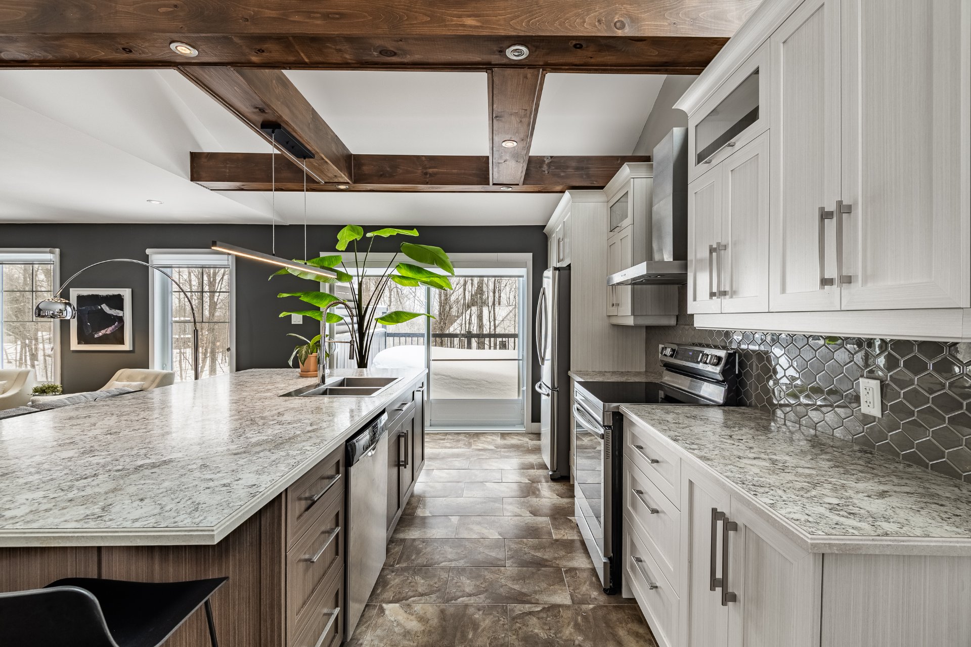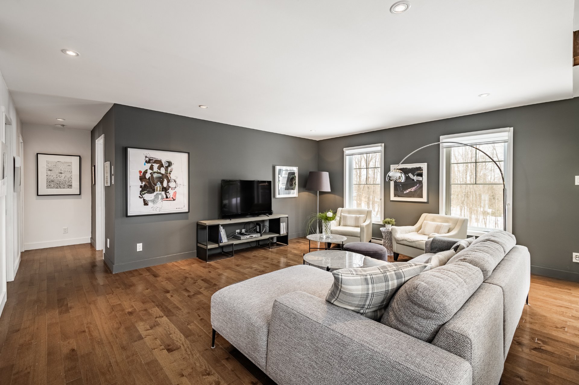 L'aire de vie principale propose un lumineux concept à aire ouverte réunissant salon, salle à manger et cuisine autour d'un grand îlot central. Les planchers de bois franc et l'éclairage soigné créent un espace chaleureux, prolongé par un balcon idéal pour profiter de l'été.
